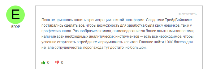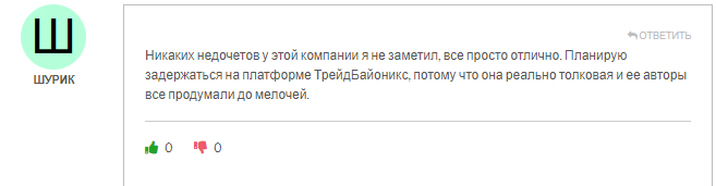 Один из пользователей, выразил положительное отношение к дилеру. Он отметил отсутствие недочетов и описал платформу как отлично продуманную и толковую. Пользователь планирует остаться на TradeBaionics, что говорит о его уверенности в этом брокере.